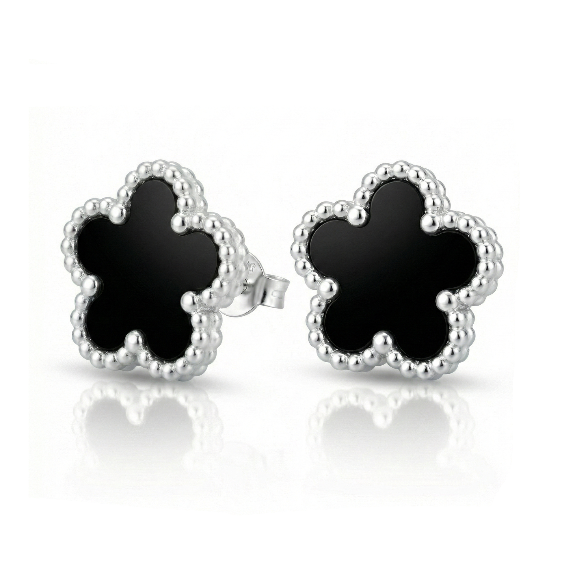 עגילי תלתן הם עגילים צמודים בצורת פרח עם שילוב צבעים היסטרי של שחור וכסף שיוצר ניגודיות מושלמת.