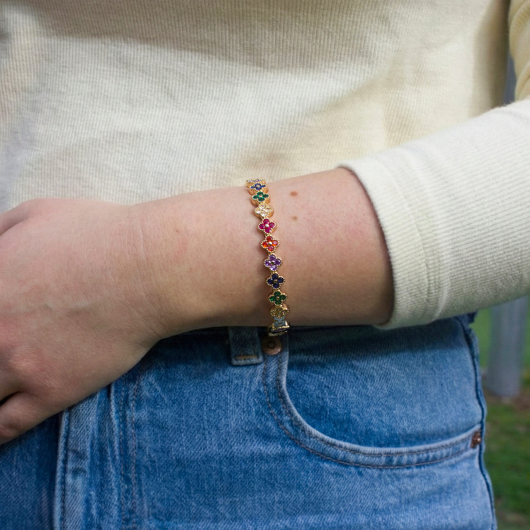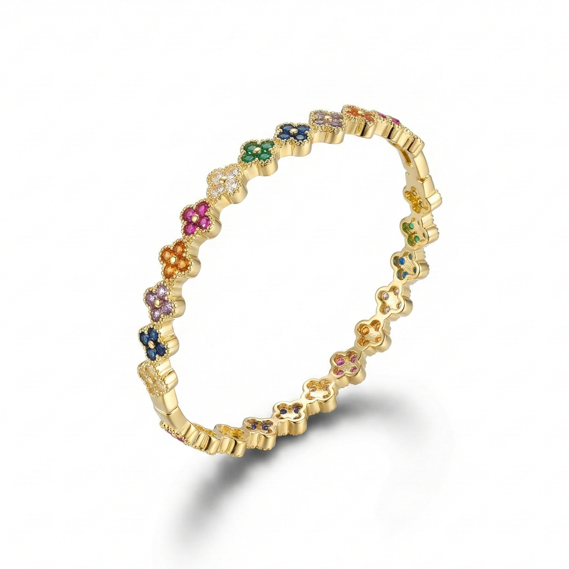 הטרנד הצבעוני מעולם לא נראה טוב יותר. צמיד קשיח בעיצוב פרחוני שובה לב, המשלב גוונים עזים עם גימור זהב יוקרתי.